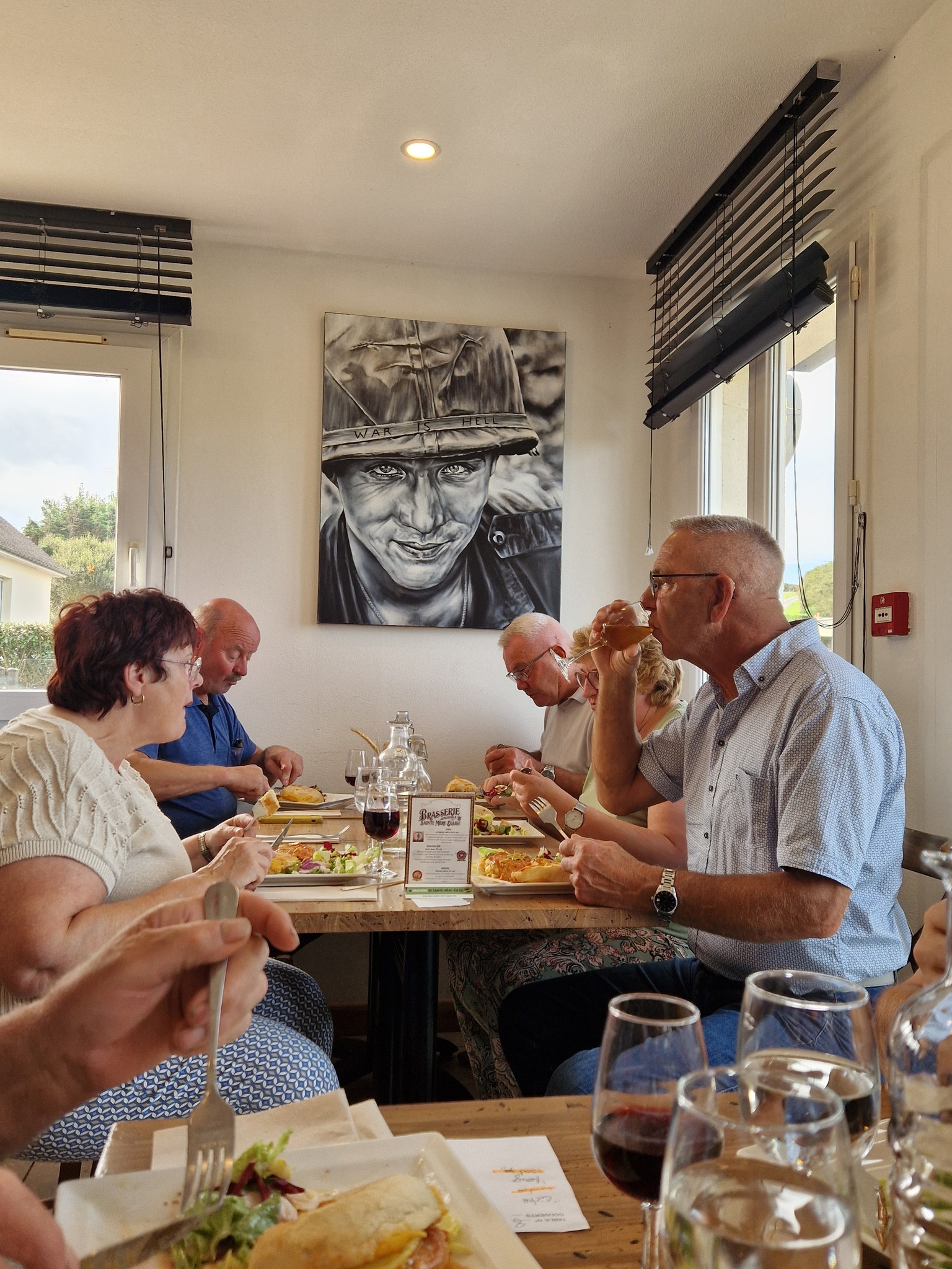 Ons 1e bezoek is aan de 360 graden bioscoop van Arromanches waar een film van de invasie alsook van de bevrijding getoond wordt. Omdat we vanochtend, door een ongeluk op de snelweg, een flink eind moesten omrijden is het alweer lunchtijd. In het restaurant hangen diverse schilderijen van geallieerden.